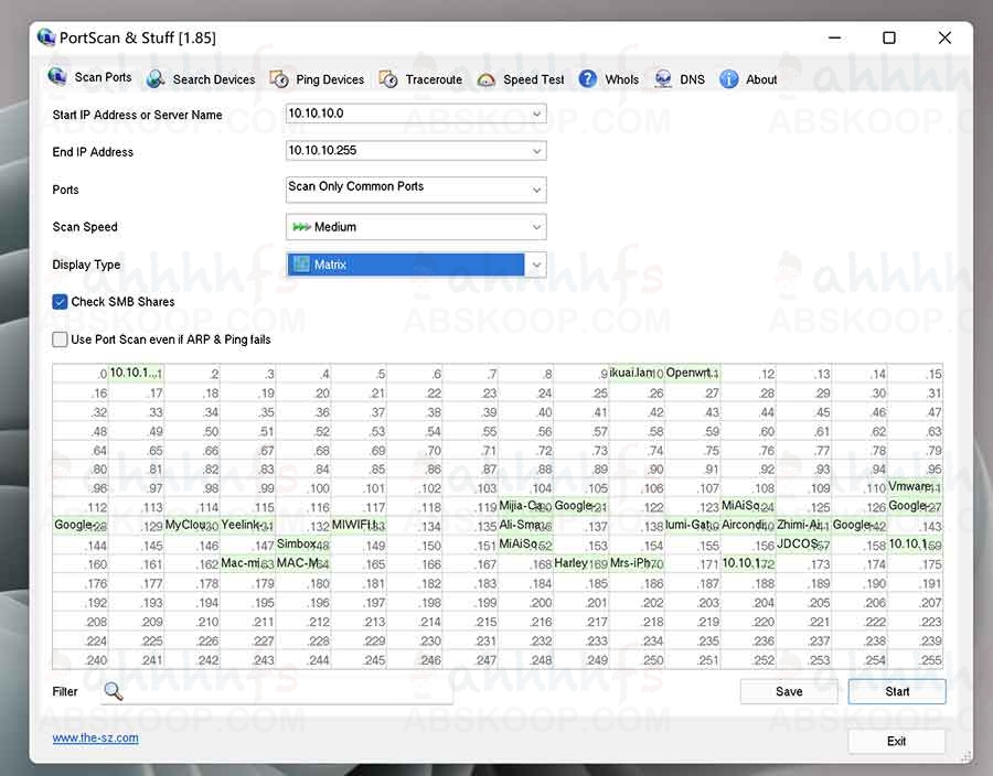 PortScan显示所有打开的端口以及主机名,MAC地址,HTTP,SMB,FTP,iSCSI,SMTP和SNMP服务等附加信息。最多100个线程用于扫描大型IP地址范围。