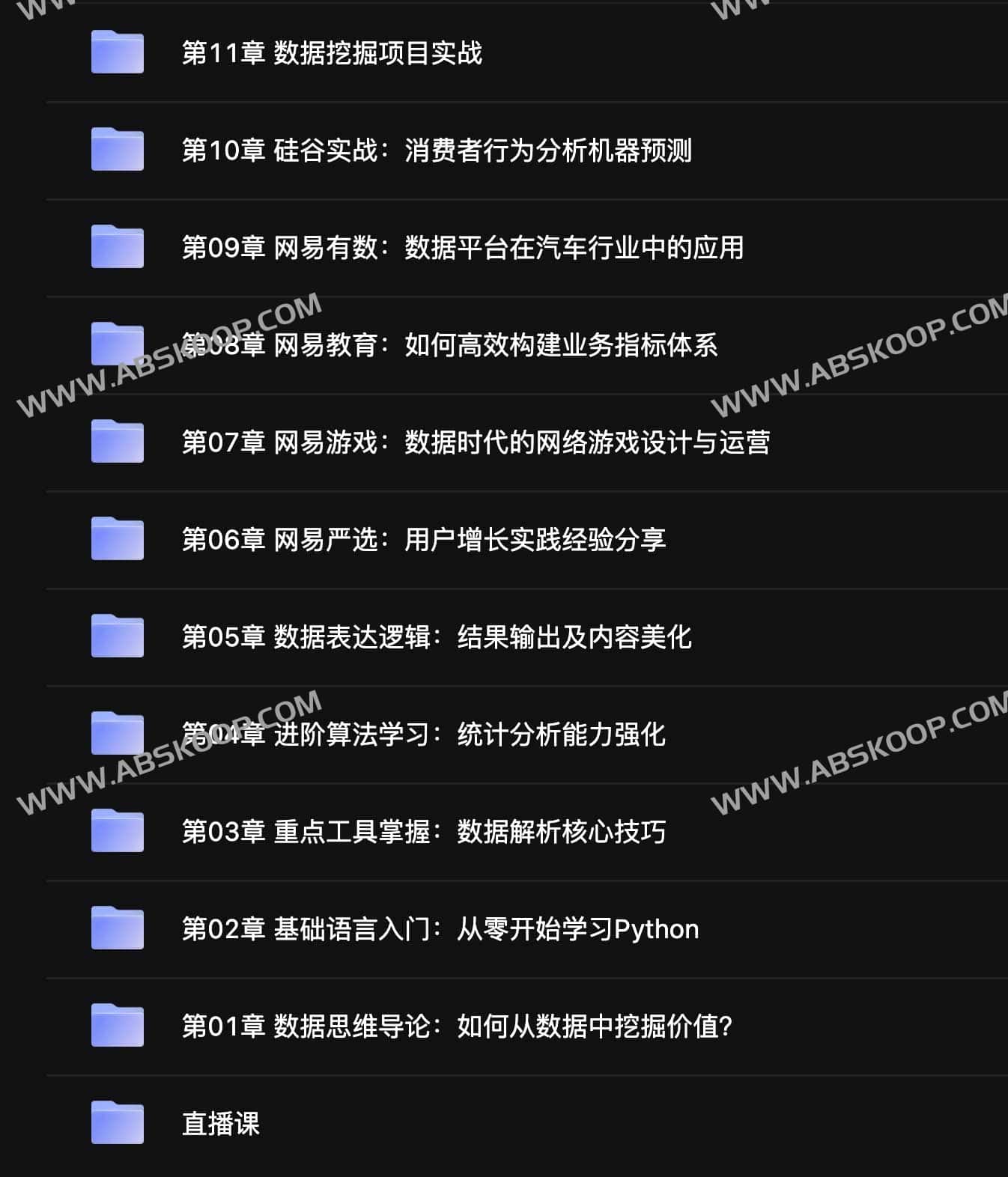在以后的章节里还有算法、数据挖掘项目实战、硅谷实战:消费者行为分析机器预测、数据时代的网络游戏设计与运营等等。